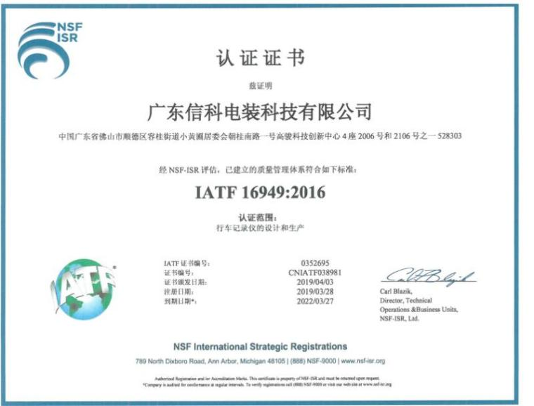 經(jīng)過嚴(yán)格審查,我司廣東泰途科技有限公司(原:廣東信科電裝科技有限公司)順利通過了IATF16949:2016質(zhì)量體系認(rèn)證, 并在2019年4月3日正式拿到該證書。這標(biāo)志著我司的產(chǎn)品獲得了進(jìn)入汽車市場領(lǐng)域的綠色通行證,為公司日后的蓬勃發(fā)展奠定了堅(jiān)實(shí)的基礎(chǔ)。
