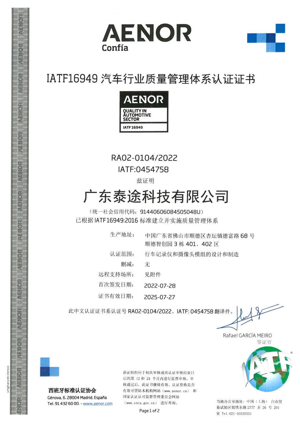 經權威認證機構審核通過,我司廣東泰途科技有限公司再次順利通過了IATF16949:2016質量管理體系認證,并在2022年7月28日正式拿到該證書。通過該體系的認證,表明我司在行車記錄儀和攝像頭模組的設計和制造全面符合IATF16949:2016汽車行業質量管理體系的要求,取得IATF認證標志著我司的產品獲得了進入汽車市場領域的準入綠色通行證,對進一步拓展汽車產品業務產生積極影響。